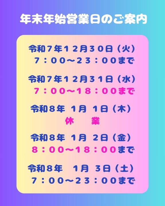 1月3日(土)より平常通り営業致します。 午前7時~午後11時